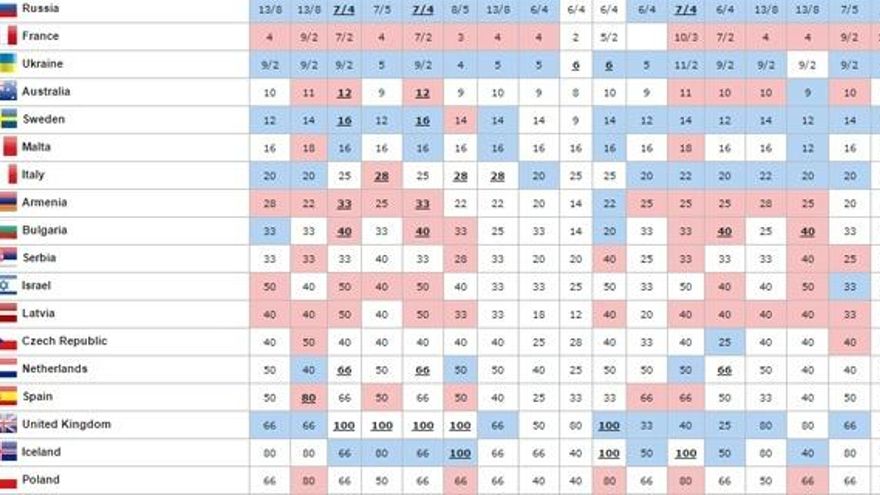 En los últimos días se han producido algunos cambios en la clasificación del portal de apuestasOddschecker. Y mientras que los dos primeros puestos permanecen intactos, con Rusia y Francia como grandes favoritos, la representante española ha descendido hasta el puesto 15, alejándose del Top 10 en el que se llegó a situar hace unas semanas.