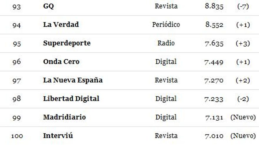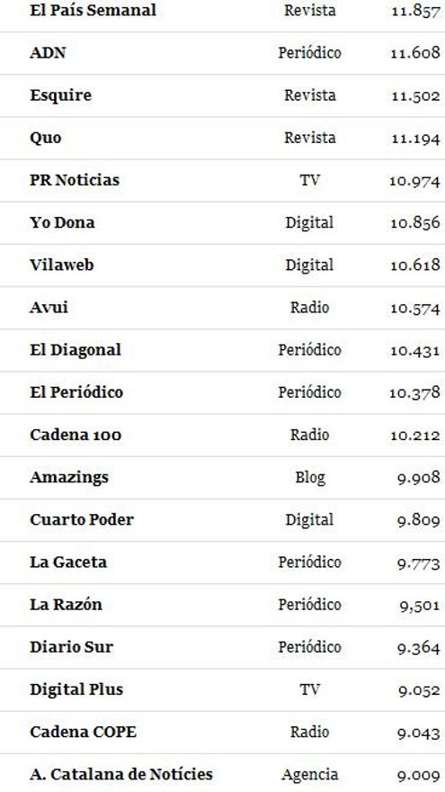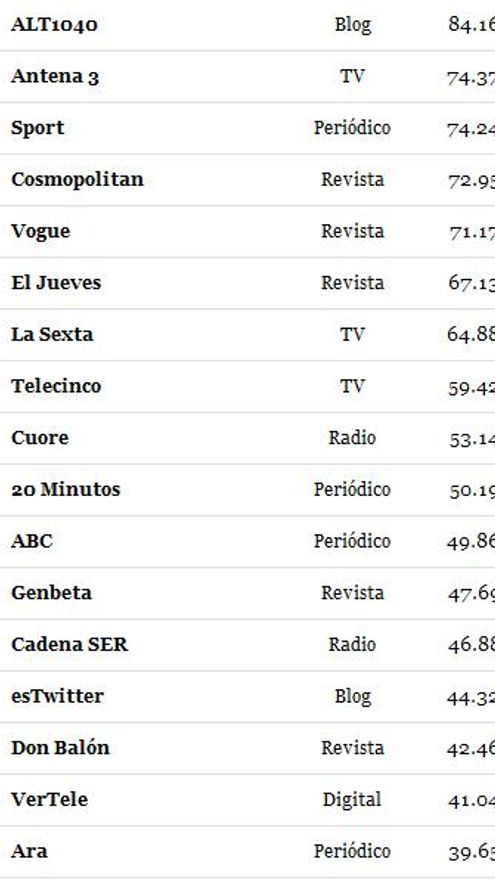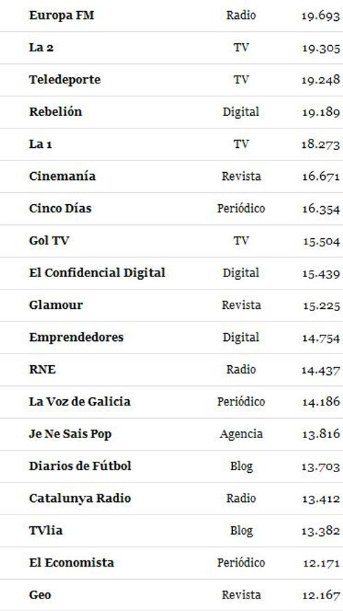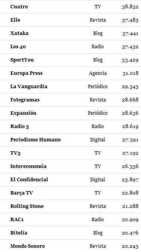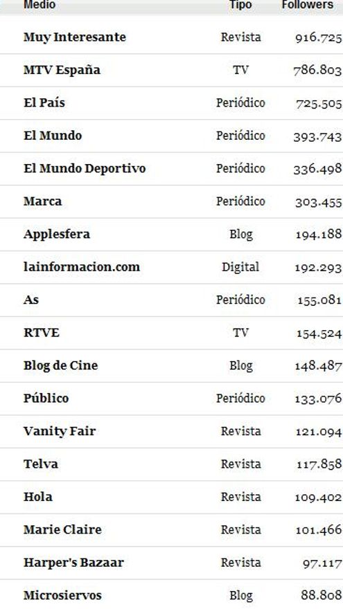 Les ofrecemos la clasificación completa con el detalle del número de seguidores de cada medio.