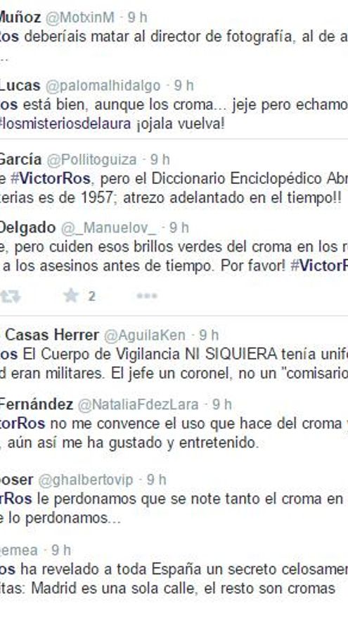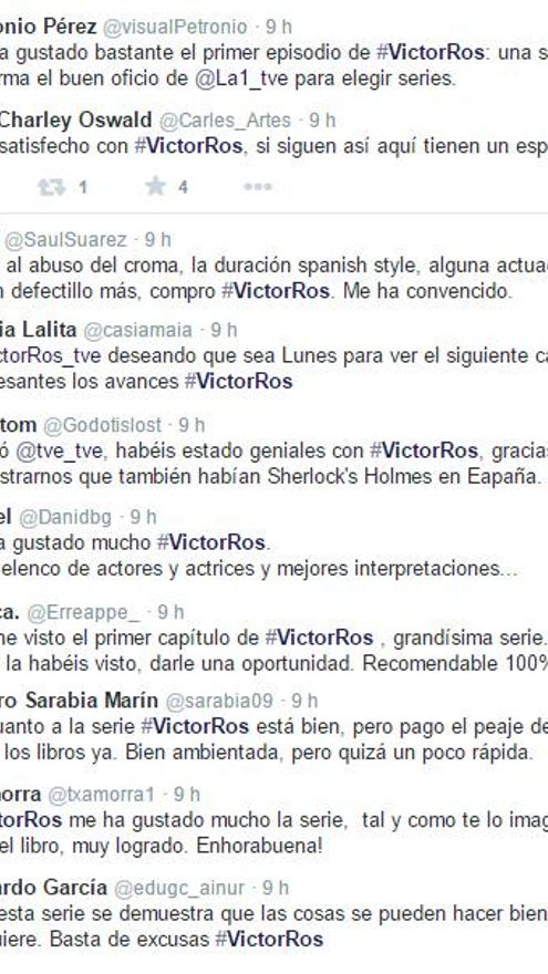 El estreno de 'Víctor Ros' en TVE convirtió a la serie en Trending Topic dejando en la red social un alud de comentarios positivos sobre el Sherlock Holmes español. Tanto el reparto encabezado por Carles Francino, Esmeralda Moya y Megan Montaner como la trama y la adaptación de los libros tuvieron buenas críticas. Al parecer, el público toma la ficción como una buena sustituta para los amantes de 'Los misterios de Laura'. Los brillos verdes de los cromas fueron los que se llevaron la peor parte.