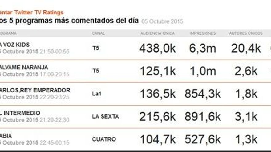 'La Voz Kids' lidera tanto en la audiencia tradicional como en la social. El programa de Telecinco crece en más de 12.000 tweets de impacto con respecto a la semana anterior gracias a la llegada de las batallas. La segunda posición también recae en Telecinco, en este caso para 'Sálvame Naranja', que supera los 10.000 tweets de impacto.