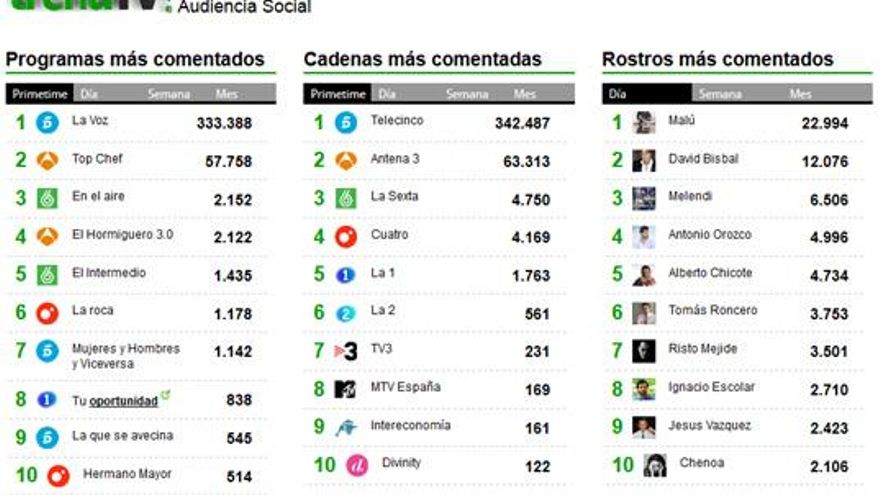 La Voz se despidió ayer con récord histórico de comentarios para un programa desde que existen las redes sociales. El programa de Telecinco generó más de 300.000 menciones (el doble de lo habitual). Le siguió la final de Top Chef, que también duplicó su audiencia social habitual, con casi 60.000 comentarios.