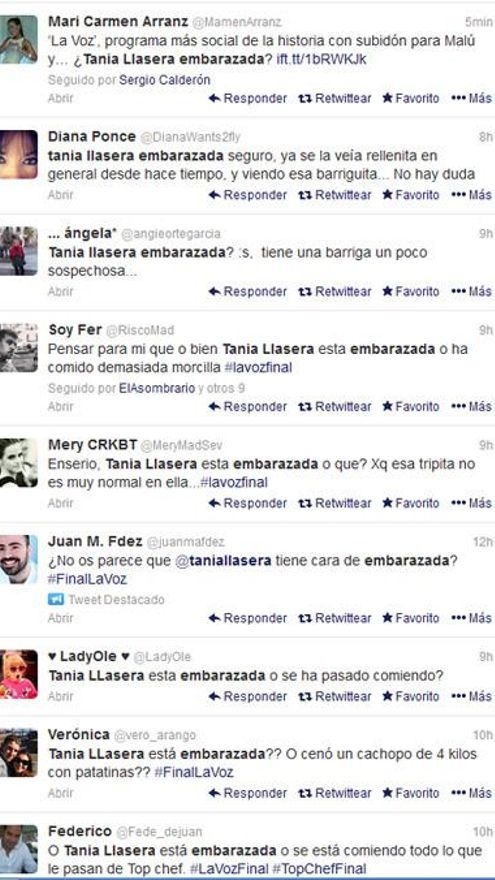 Uno de los comentarios sorpresa de la noche fue el posible embarazo de la copresentadora, Tania Llasera, con el que especularon muchos usuarios con comentarios como estos: