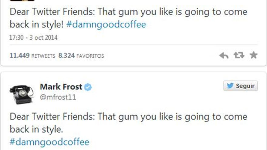Los rumores apuntan a que Twin Peaks, la serie célebre de principios de los 90, podría volver 25 años después de su nacimiento. Al menos eso parece tras ver los tuits de los creadores de la ficción, David Lynch y Mark Frost, que reflejan el siguiente mensaje: “Queridos amigos de Twitter: Ese chicle que os gusta se va a poner de moda #damngoodcoffee”.