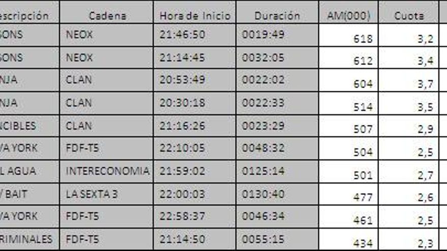 Los 10 programas más vistos del día en TDT