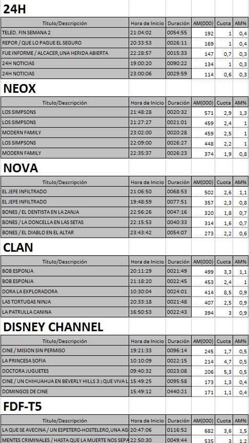 Top 5 programas por cadenas del domingo en la TDT