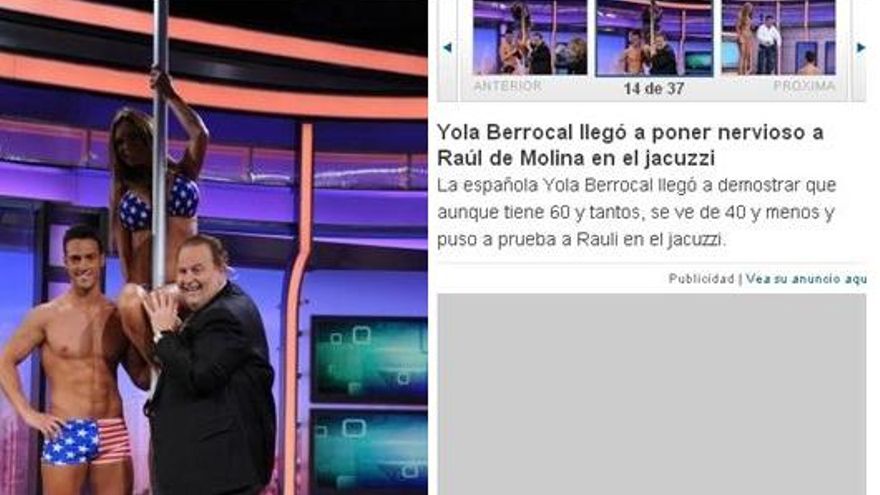 En la página oficial del popular espacio de la cadena Univisión narraron su visita como “La española Yola Berrocal llegó a demostrar que aunque tiene 60 y tantos, se ve de 40 y menos y puso a prueba a Rauli en el jacuzzi”. La manchega tiene 42 años.