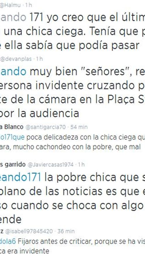 La audiencia, a la que afortunadamente no se le escapa una, clamó en contra de lo que estaba ocurriendo a través de las redes sociales: “Qué poca delicadeza con la chica ciega”, “la pobre chica que se cuela en el plano es ciega ¡por eso cuando se choca se sorprende!”