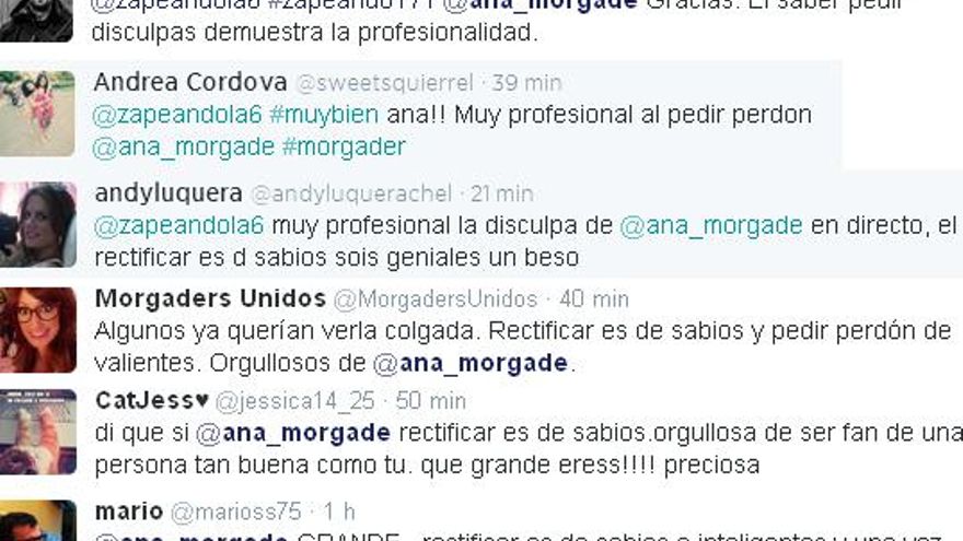 “Muy profesional la disculpa de Ana Morgade, el rectificar es de sabios, sois geniales”, afirmaba un usuario. “Orgullosa de ser fan de una persona como tú”, le escribía una tuitera a su ídolo.